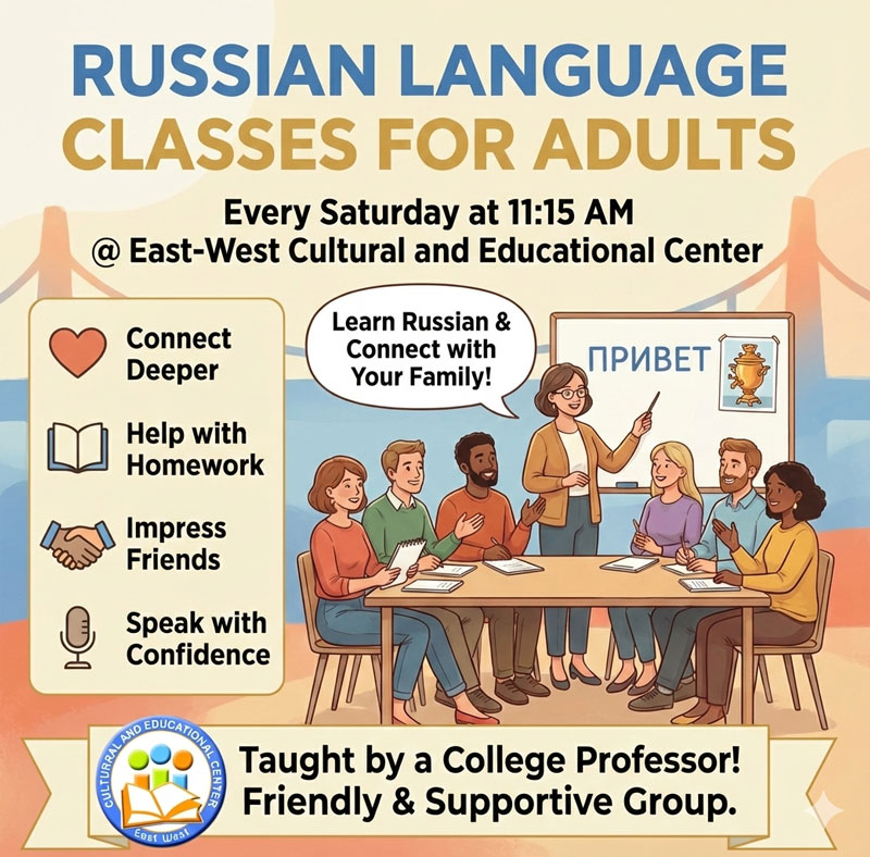 The East‑West Cultural and Educational Center is excited to offer Russian language classes for adults. Our professional instructors will help you gain the skills and confidence to communicate with your children, family members, and the wider Russian‑speaking community.